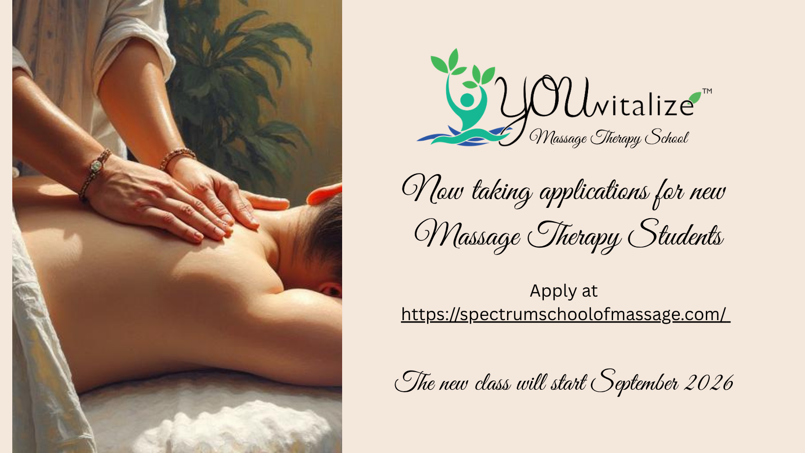 YOUvitalize is the Bismarck branch of Spectrum School of Massage out of Minot. This is our 4th year here at YOUvitalize, and WE ARE NOW TAKING APPLICATIONS for students starting September of 2026. Please go to www.spectrumschoolofmassage.com to apply. We have expanded our hours and students will be taking appointments with the outside public from November 2026 through mid March 2027. They will be offering 30, 50 and 80-minute massages on Tuesday, Wednesday and Thursday afternoons from 1:00 – 5:00, and Friday mornings from 9 – 2:00. These massages are done in a group setting with beautifully draped dividers separating each student in their own private cabana. We invite you to try a student massage at discounted rates! Students can receive cash tips.